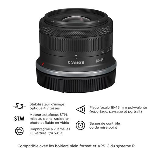 - L’objectif RF-S 18-45mm F4.5-6.3 IS STM est le « zoom transtandard » abordable idéal pour ceux qui s’essayent au système hybride EOS R APS-C pour la première fois. L’objectif RF-S 55-210mm F5-7.1 IS STM est un télézoom polyvalent;